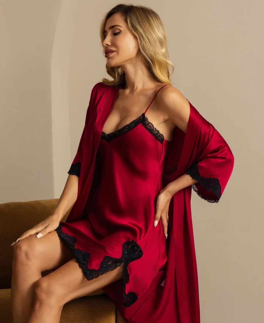 Set 2 Pezzi Camicia da Notte & Accappatoio in Seta Pura con Bordo in Pizzo Spacchettato