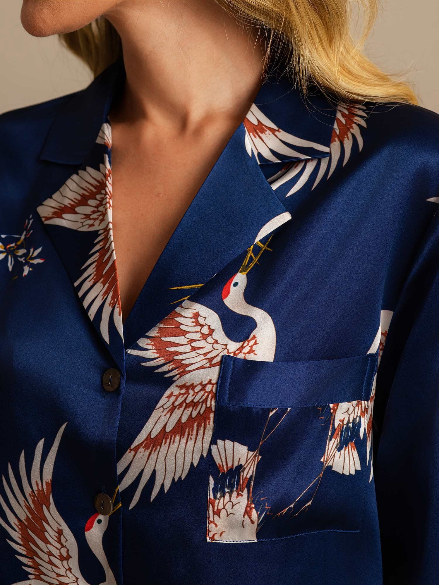 19Momme Pure Seta Camicia da Notte con Stampa Gru e Orlo High-Low