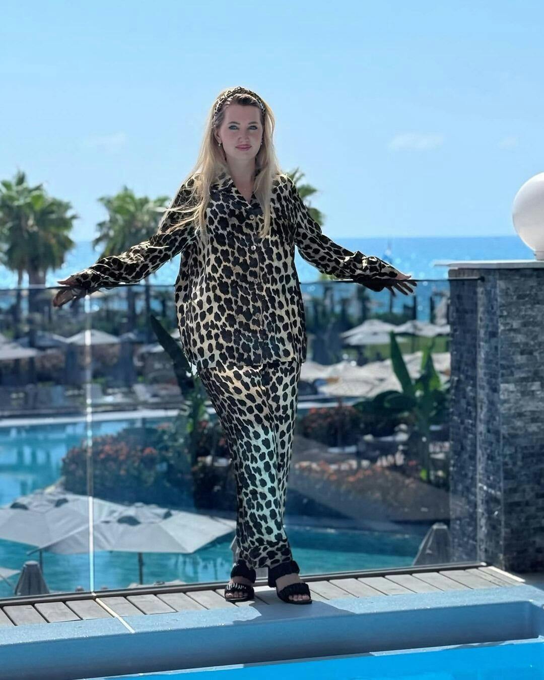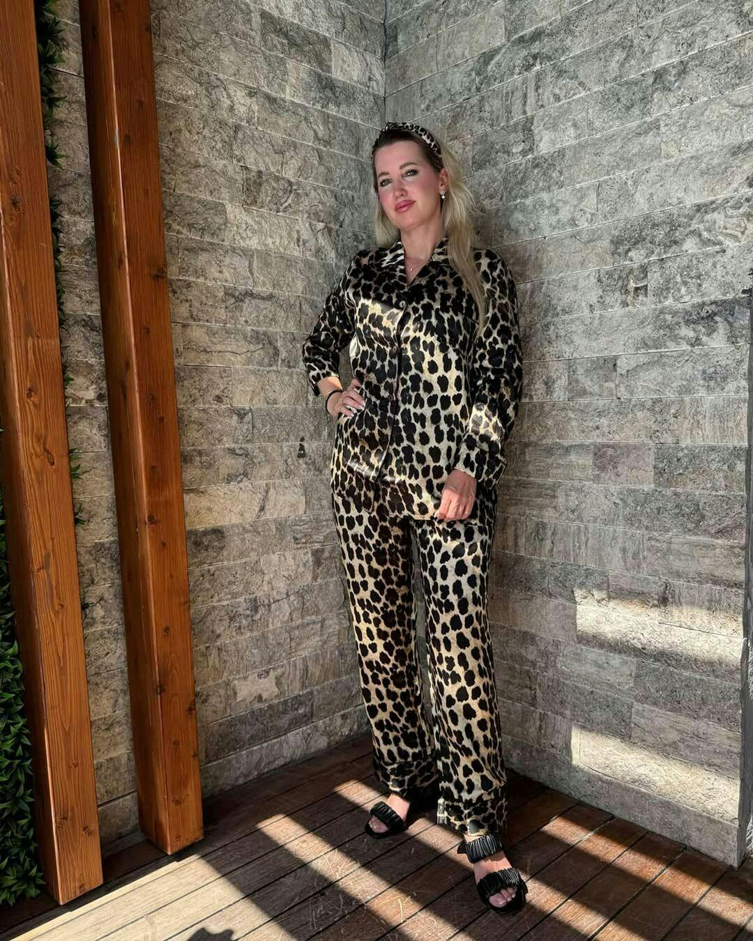 Pura Seta Leopardo Stampa Lunghe Maniche Pantaloni Pigiama